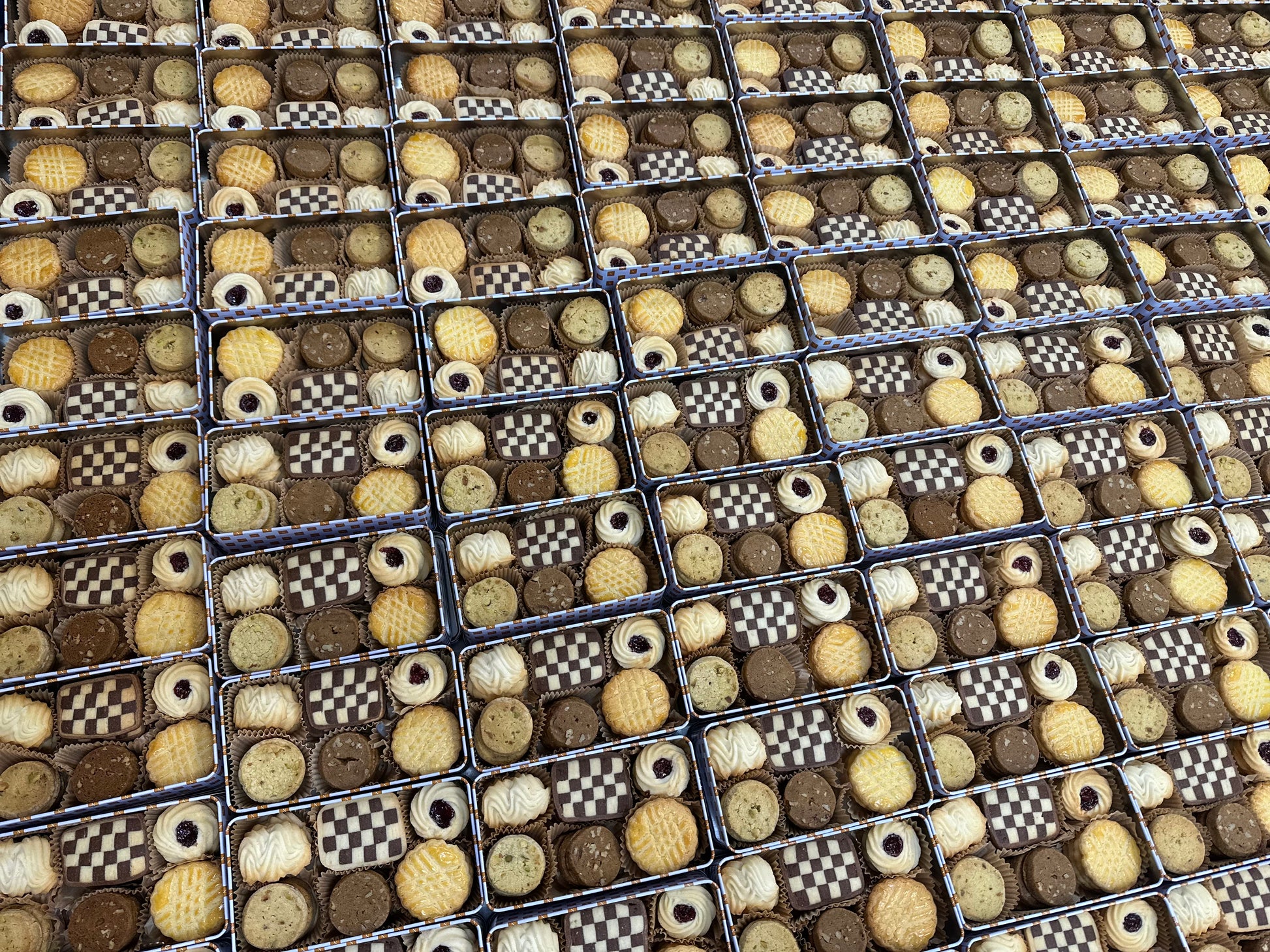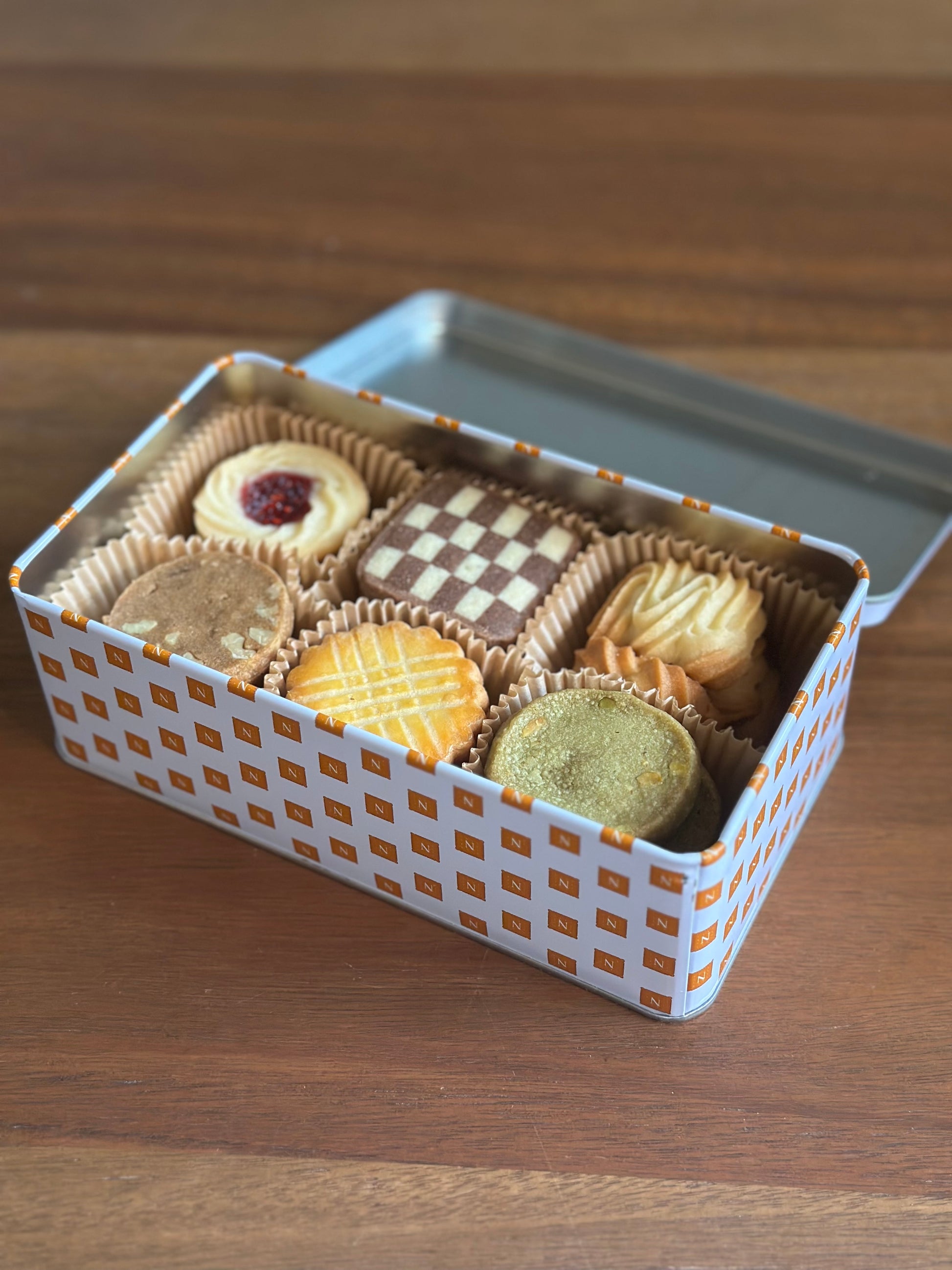 A timeless French cookie tin featuring 20 handcrafted petit fours cookies — spritz, raspberry sablé, checkerboard, pistachio, coffee pecan, and sablé breton. Each cookie is buttery, light, and delicately sweet, made from scratch with wholesome ingredients and no preservatives.